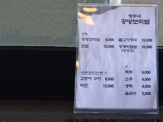 Came to Ilgwang, Gijang for boribap as lunch. This restaurant is located in a small neighborhood along the shore known as On-jeong Village 온정마을 - well known with cafe and restaurant with open sea view. The hearty lunch of the day is boribap course @ 8,000 won & grilled mackerel @ 8,000won. Bo-ri-bab is steamed rice with barley, served with doenjang-guk, vegetables side dishes as well as gochujang. It's a vegetarian course. It can be eaten along with the side dishes and dwenjang jiggae, or bibim it with desire namul and gochujang provided. The mackerel doesn't come along with the course, it's an extra order. I prefer bibim so I make it bibm-bap style. Ithis is my second time having boribap bibimbap in Busan. It's taste really nice and more heathier feel compare to eating normal white rice.